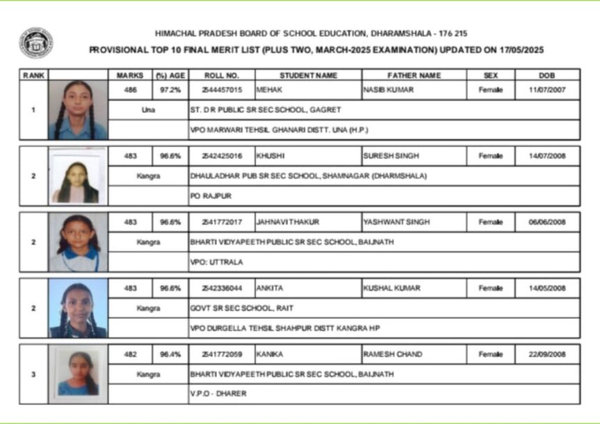 कांगड़ा के डीसी और स्कूल शिक्षा बोर्ड के चेयरमैन हेमराज बैरवा व बोर्ड सचिव डॉ. विशाल शर्मा ने धर्मशाला में परिणाम की घोषणा की।