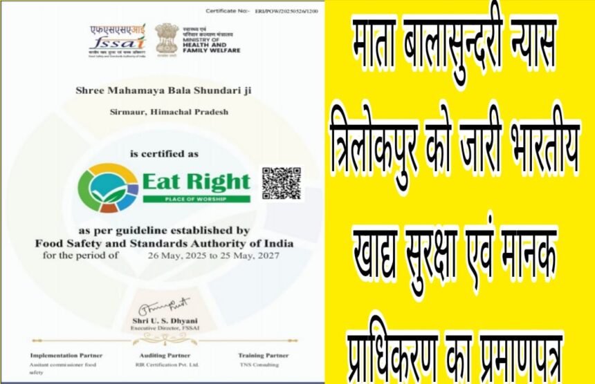 नाहन (सिरमौर): माता बाला सुंदरी मंदिर, जो श्रद्धा और आस्था का प्रमुख केंद्र है, को भारतीय खाद्य सुरक्षा एवं मानक प्राधिकरण (FSSAI) द्वारा वर्ष 2025-26 के लिए खाद्य सुरक्षा प्रमाणपत्र जारी किया गया है। यह प्रमाणपत्र मंदिर में श्रद्धालुओं को वितरित किए जाने वाले प्रसाद की गुणवत्ता, स्वच्छता और सुरक्षा के उच्च मानकों को प्रमाणित करता है।