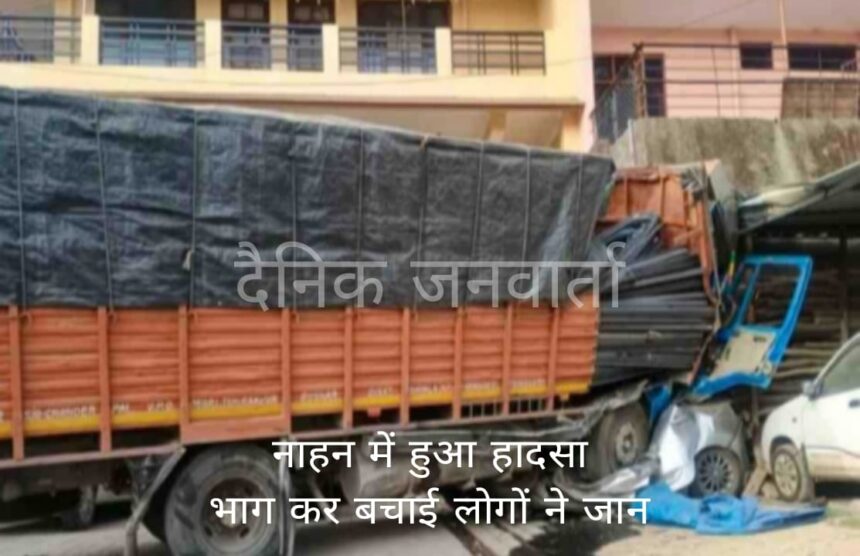 नाहन (सिरमौर): नाहन-कुमाहट्टी हाईवे पर बुधवार देर रात दर्दनाक सड़क हादसा हुआ। सरिया से भरे एक तेज रफ्तार ट्रक के ब्रेक फेल हो गए, जिससे वह बेकाबू होकर एक कार और बाइक को कुचलते हुए घर की दीवार से जा टकराया। हादसे के समय सड़क पर मौजूद लोगों ने भागकर अपनी जान बचाई। वहीं, ट्रक चालक ने भी ट्रक से कूदकर जान बचा ली।