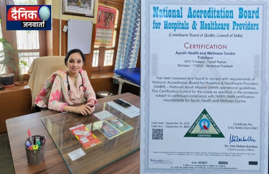 कालाअंब (सिरमौर)। सिरमौर जिले के त्रिलोकपुर स्थित राजकीय आयुर्वेदिक औषधालय को राष्ट्रीय स्तर पर बड़ी उपलब्धि हासिल हुई है। भारतीय गुणवत्ता परिषद की शाखा नेशनल एक्रेडिटेशन बोर्ड फॉर हॉस्पिटल एंड हेल्थकेयर प्रोवाइडर्स (NABH) द्वारा इस औषधालय को राष्ट्रीय आयुष मिशन के अंतर्गत बेहतर चिकित्सा सेवाओं के लिए प्रमाणित किया गया है।