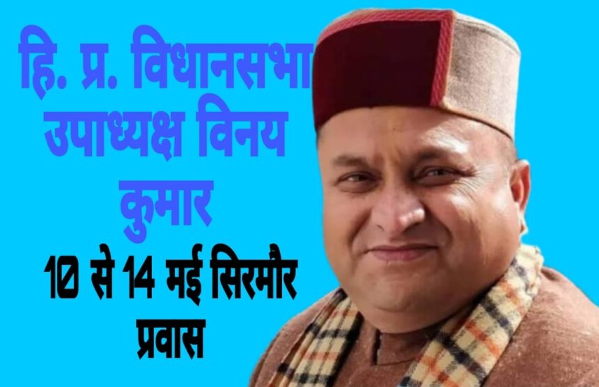 नाहन, 09 मई: हिमाचल प्रदेश विधानसभा उपाध्यक्ष विनय कुमार 10 से 14 मई, 2025 तक जिला सिरमौर के आधिकारिक दौरे पर रहेंगे। यह जानकारी एक सरकारी प्रवक्ता ने दी है। इस दौरान वे विभिन्न विकास कार्यों का उद्घाटन और शिलान्यास करेंगे, साथ ही क्षेत्रीय जनता से मिलकर उनकी समस्याओं को सुनेंगे।